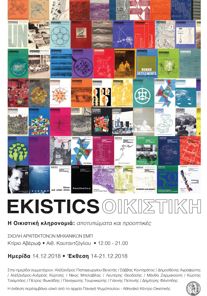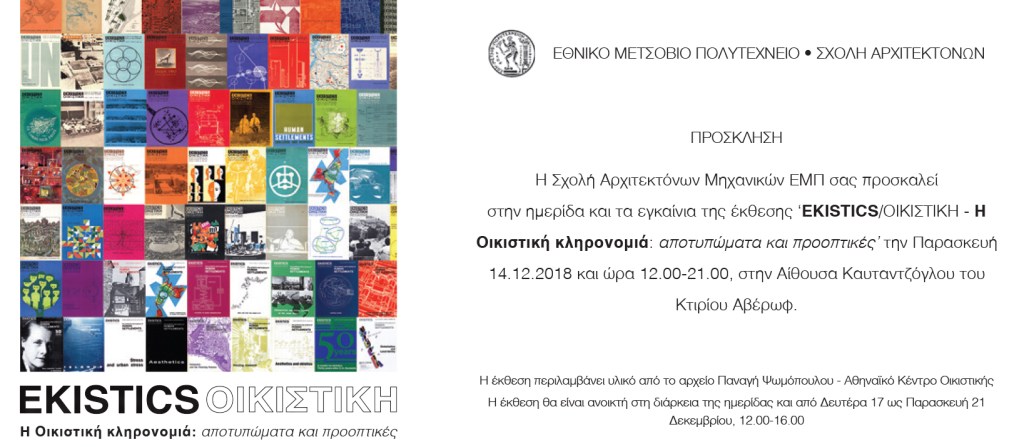 Η Σχολή Αρχιτεκτόνων ΕΜΠ σας προσκαλεί στην ημερίδα και την έκθεση με τίτλο “Ekistics Οικιστική: Η Οικιστική κληρονομιά: αποτυπώματα και προοπτικές” που οργανώνεται την Παρασκευή 14 Δεκεμβρίου από τις 12.00 ως τις 21.00 στην αίθουσα Καυταντζόγλου του κτιρίου Αβέρωφ, στη Σχολή Αρχιτεκτονων ΕΜΠ.