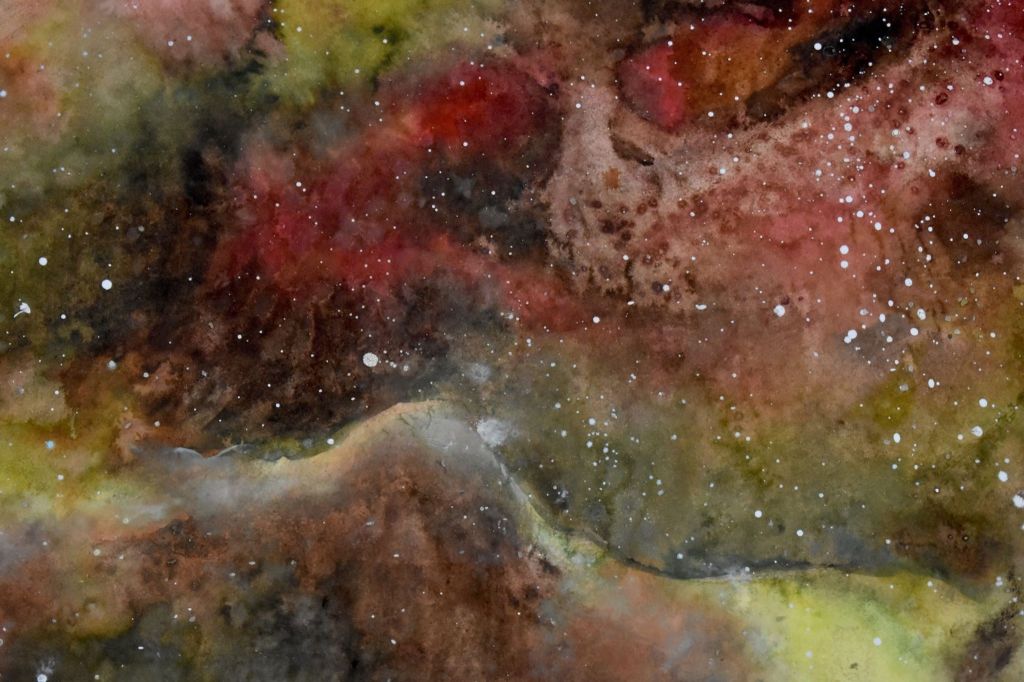 Πάνω στην επιφάνεια του χαρτιού, η δημιουργός ακολουθώντας μια ευέλικτη και λιτή ζωγραφική διαδικασία, που κυριαρχείται από την παρατήρηση της συμπεριφοράς των υλικών, μεταγράφει φανταστικούς αστερισμούς. Η τύχη έχει θεμελιώδη ρόλο στο αποτέλεσμα. Λειτουργεί σαν μαέστρος πάνω στις χρωματικές παρτιτούρες της εικαστικού. Οι μικρές διαστάσεων ακουαρέλες θα μπορούσαν να είναι οι ζωγραφικές σημειώσεις της περίφημης αρχής της αβεβαιότητας του Χάιζενμπεργκ. Η συγκεκριμένη θεωρία της Κβαντομηχανικής υποστηρίζει πως η τύχη κυβερνά ορισμένα φυσικά φαινόμενα. Οι ίδιες αρχικές συνθήκες δεν δίνουν το ίδιο αποτέλεσμα. Στον κόσμο των πολλαπλών συμπάντων τα έργα της Ελεάννας Μαρτίνου είναι πολλαπλές εκδοχές του αρχικού συμβάν, της στιγμής που συναντά το πινέλο την επιφάνεια του χαρτιού.