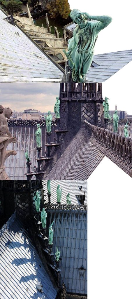 Ο Viollet-le-Duc σκηνοθετεί τον εαυτό του τοποθετώντας τον στην κορυφή της Παναγίας των Παρισίων, ανάμεσα στους δώδεκα Αποστόλους. Και ενώ τα υπόλοιπα γλυπτά κοιτάζουν προς την πόλη, σε μια άκρως συμβολική επιλογή, ο ίδιος, ως δημιουργός και επί κεφαλής, κοιτάζει ψηλά προς το έργο του, έχοντας την πλήρη εποπτεία.