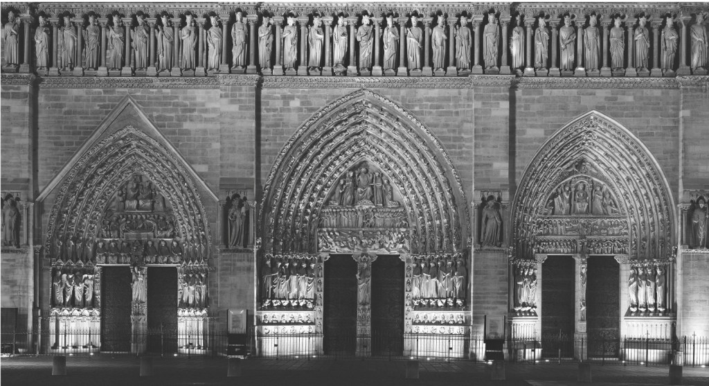«Οι καλλιτέχνες του Μεσαίωνα δεν είχαν ποτέ την ιδέα να καλύψουν με χρώμα ολοκληρωτικά μια όψη 50 μέτρων και ύψους 70 όπως αυτή της Notre-Dame του Παρισιού. Όμως σε αυτές τις τεράστιες όψεις υιοθέτησαν εν μέρει τον χρωματισμό τους. Έτσι, στην Notre-Dame του Παρισιού, οι τρεις πύλες της πρόσοψης, μαζί με τα επάλληλα τόξα και τα τύμπανα τους, ήταν ολόκληρες ζωγραφισμένες και επιχρυσωμένες. Οι τέσσερις κόγχες που συνδέουν τις θύρες και που περιέχουν τέσσερα κολοσσιαία αγάλματα ήταν επίσης ζωγραφισμένες. Πιο πάνω, η στοά των βασιλέων, σχημάτιζε μια ζώνη χρωματισμένη και επίχρυση. Η ζωγραφική, πάνω από αυτή τη ζώνη, δεν συνδεόταν παρά με τα δύο μεγάλα τοξωτά παράθυρα κάτω από τους πύργους των κωδωνοστασίων και τον κεντρικό ρόδακα που ανακλούσε το χρυσό. Το ανώτερο κομμάτι της όψης, που χάνεται στην ατμόσφαιρα, αφήνονταν στον τόνο της πέτρας. Εξετάζοντας την όψη, είναι εύκολο να αντιληφθούμε την έξοχη εντύπωση που πρέπει να προκαλούσε αυτό το τμήμα του ναού που βρίσκονταν σε τόση συμφωνία με την όλη αρχιτεκτονική σύνθεση».[13]