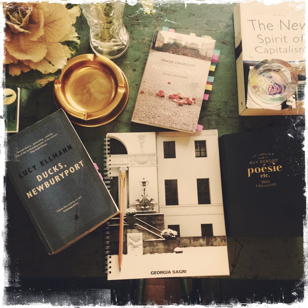 Φέτος με συγκλόνισε (και εξακολουθεί να με συγκλονίζει, γιατί επανέρχομαι καθημερινά σ᾽ αυτό) το επίτευγμα της Lucy Elllmann, ένα μεγαλειώδες μυθιστόρημα, το Ducks, Newburyport. 1030 σελίδες, τρεις παράγραφοι όλες κι όλες, λόγος που ρέει, ένας σπαρακτικός, αλλά και γεμάτος χιούμορ και μελωδία μονόλογος. Επίσης, το βιβλίο Poésie, etc., του Guy Debord, όπου στεγάζονται οι σημειώσεις που κρατούσε διαβάζοντας Arthur Cravan, Charles Baudelaire, τη Βίβλο, Francois Villon, Novalis, κτλ. Σημαντικό είναι το βιβλίο του Νικήτα Σινιόσογλου Λεωφόρος ΝΑΤΟ (εκδ. Κίχλη), μια έξοχη δοκιμή ψυχογεωγραφίας και περιπλάνησης, με την ιδιαίτερη γραφή του Σινιόσογλου που συνδυάζει τη φιλοσοφία με το δοκίμιο και τη λογοτεχνία. Εντυπωσιακή, τόσο στη μορφή όσο και στο περιεχόμενο, η μονογραφία Georgia Sagri Georgia Sagri and I όπου μια πλειάδα λαμπρών θεωρητικών και ιστορικών τέχνης (ανάμεσά τους οι Daniel Horn, Σωτήρης Μπαχτσετζής, Ruba Katrib, Stephen Squibb) εξετάζουν το πολύπτυχο έργο της διεθνούς καλλιτέχνιδος.