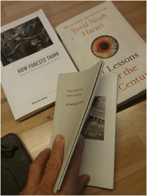 Τον Αύγουστο έζησα για ένα μήνα σε ένα υπέροχο σπίτι. Στη βιβλιοθήκη μου τράβηξε την προσοχή ένα βιβλίο που είχε τίτλο How Forests think. Ο συγγραφέας του λέγεται Eduardo Kohn, είναι ανθρωπολόγος και επιχειρεί να συγκροτήσει ένα σύστημα ανθρωπολογίας πέρα από την ηγεμονία του ανθρώπινου είδους. Για μία ώρα έμεινα μόνος στο γραφείο μιας καθηγήτριας στην σχολή αρχιτεκτόνων του Όσλο. Πιάνω στα χέρια μου και αρχίζω να ξεφυλλίζω ένα μικρό βιβλιαράκι που έχει τίτλο A Feeling of History. Είναι ένας διάλογος ανάμεσα στη συγγραφέα Mari Lending και τον Peter Zumthor. Η εικονογράφηση του είναι από τα λιθόστρωτα στο λόφο του Φιλοπάππου.