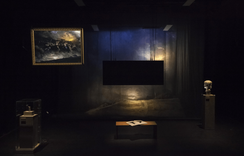 Η σκηνή θυμίζει αίθουσα μουσείου. Περιλαμβάνει: μια προτομή του Αριστοτέλη,ένα ευρωπαϊκό διαβατήριο σε γυάλινη προθήκη, μια μαύρη οθόνη, έναν πίνακα που εμπνέεται από τον μεσαιωνικό μύθο των επουράνιων κυνηγών και τον κατάλογο μιας έκθεσης. Καθιστός εκεί, ο Thomas Bellinck μας εξηγεί σύντομα πώς ξεκίνησε από την διάκριση μεταξύ δούλου και κυρίου από τα Πολιτικά του Αριστοτέλη, για να διατρέξει τα μεσογειακά σύνορα της Ευρωπαϊκής Ένωσης και να συλλέξει τις ιστορίες ανθρώπων που κυνηγούν και συνανθρώπων τους που κυνηγιούνται εκεί σήμερα. Δεν μένει για πολύ στην σκηνή.