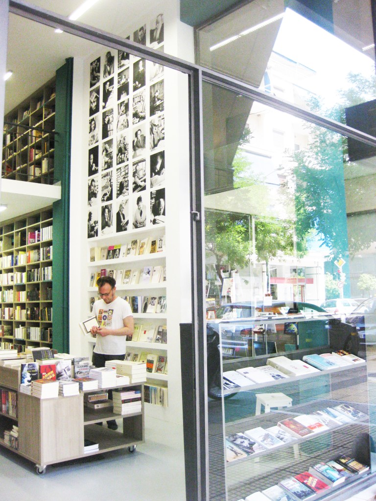 Εκτός από τις ευθυτενείς βιβλιοθήκες “διαδρόμους βιβλίων”, ένα επιπλέον στοιχείο που τονίζει τη γραμμικότητα του χώρου είναι τα επιμήκη φωτιστικά οροφής. Ο πεντάμετρος ψηλός χώρος του foyer καλύπτεται από μια πελώρια ξύλινη βιβλιοθήκη, από την οποία αντλήσαμε και την ιδέα του λογότυπου, ενώ αντιδιαμετρικά, σχεδιάσαμε μια εικαστική εγκατάσταση, μια ρυθμική τοιχογραφία-πινακοθήκη ασπρόμαυρων φωτογραφιών στην οποία φιγουράρουν 30 από τους αγαπημένους συγγραφείς του βιβλιοπωλείου.