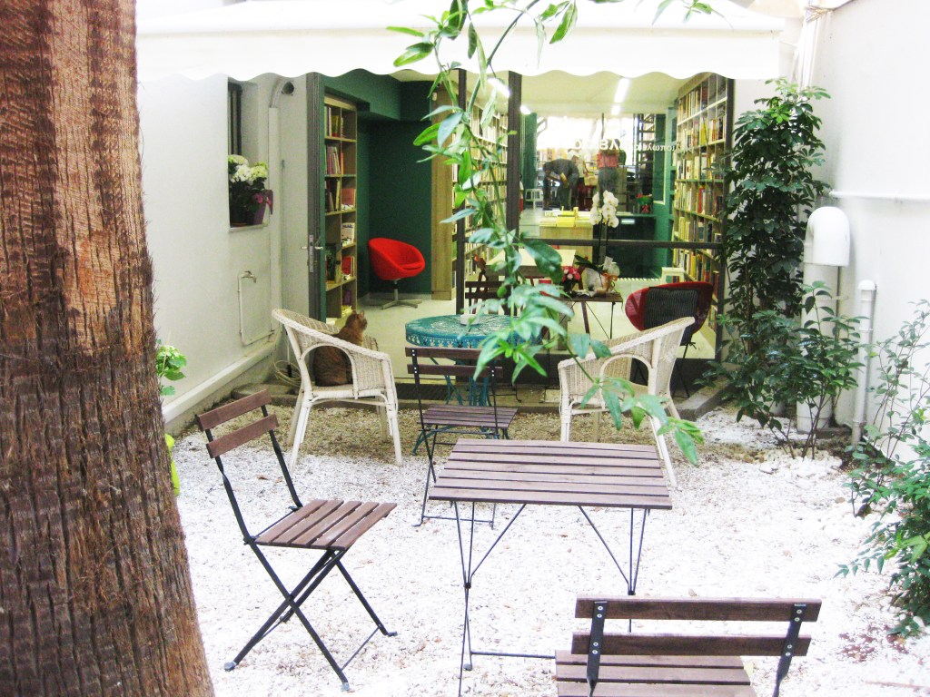 Ο πίσω εγκαταλελειμμένος ακάλυπτος της πολυκατοικίας έχει διαμορφωθεί σε κήπο του βιβλιοπωλείου και meeting point των επισκεπτών. Οι ιδιοκτήτες μεταμόρφωσαν στην κυριολεξία τον χώρο. Περιποιήθηκαν τον πανύψηλο φοίνικα, ζωντάνεψαν τα μικρά οπωροφόρα, φύτεψαν αναρριχόμενα και μυρωδικά, γέμισαν τον κήπο με γλάστρες. Λευκό χαλίκι με πατημένο χώμα και μια παλιά «αθηναϊκή» αύρα σε συντροφεύει καθισμένος σ’ ένα από τα μικρά ξύλινα τραπεζάκια τύπου γαλλικού μπιστρό, ξεφυλλίζοντας τις νέες εκδόσεις της σεζόν αλλά και παλιά αγαπημένα βιβλία. Για να τον ανακαλύψεις πρέπει να διασχίσεις ολόκληρο το βιβλιοπωλείο οπότε θα πλοηγηθείς έστω για λίγο, ανάμεσα στα βιβλία. Αυτή είναι άλλωστε η μαγεία ενός βιβλιοπωλείου.