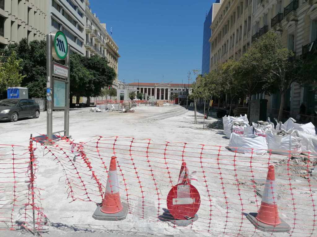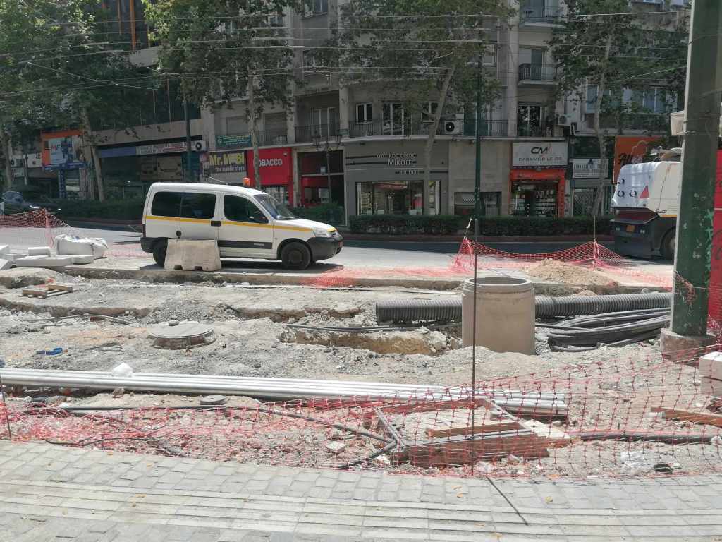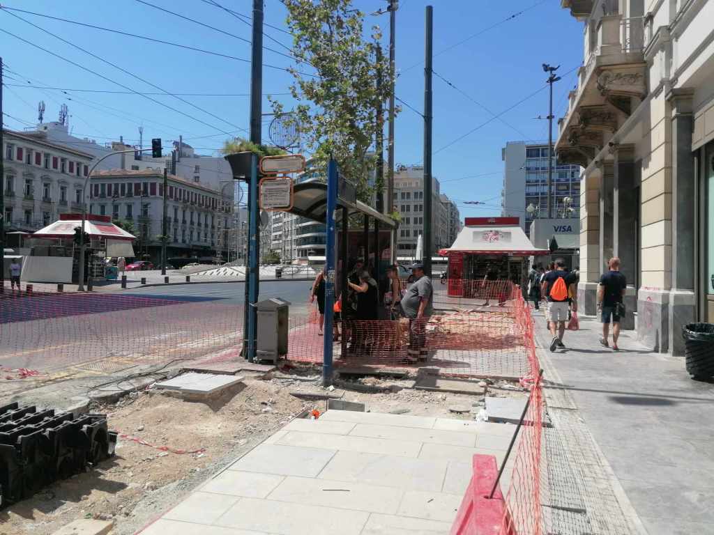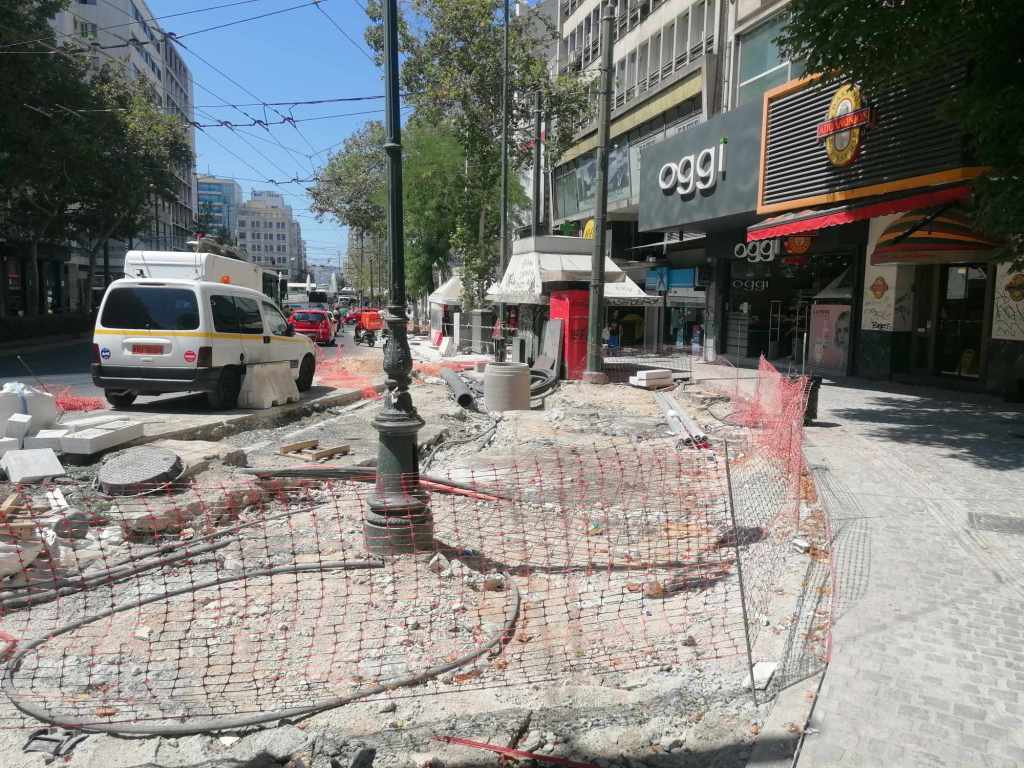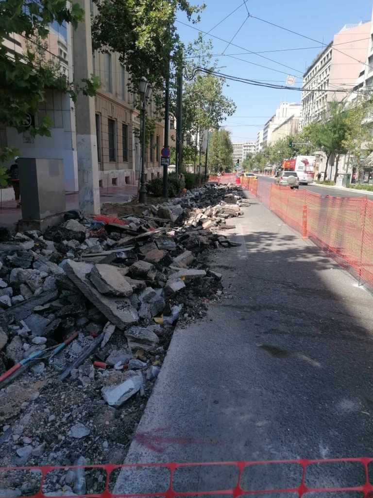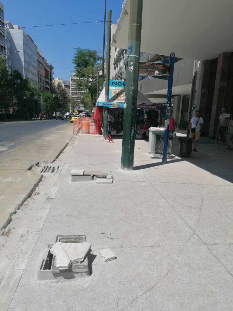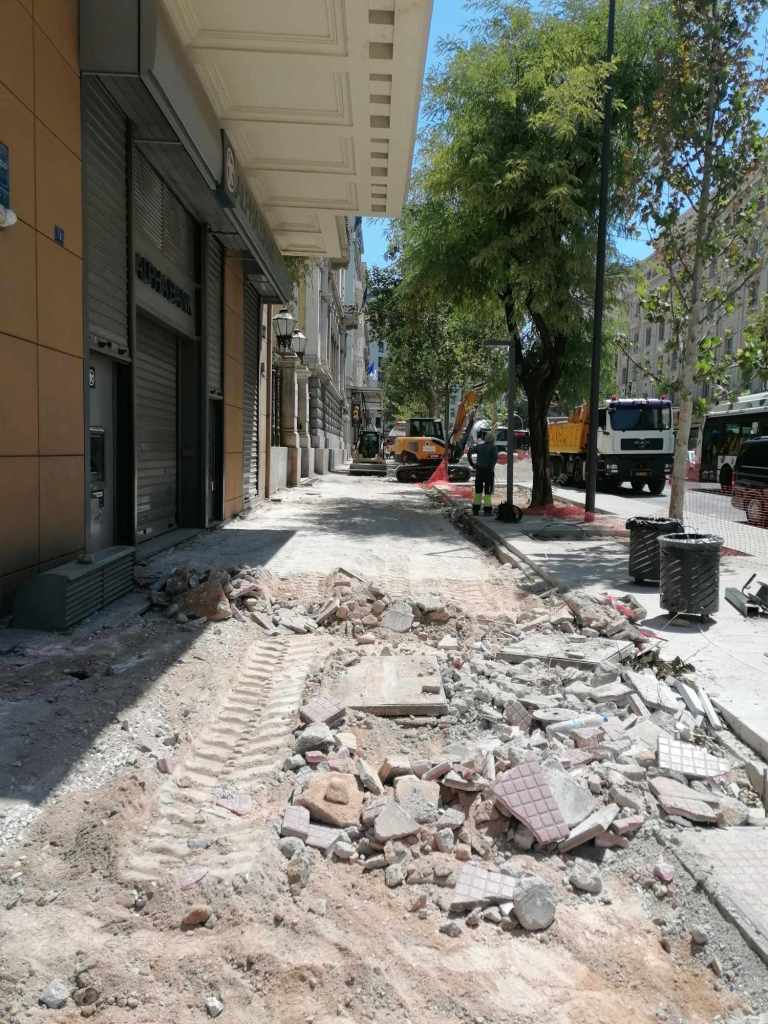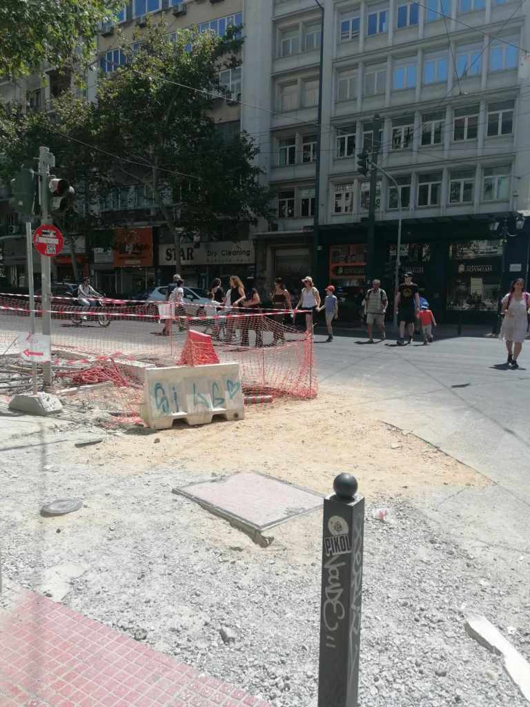 Τεράστια οπτική και ηχητική όχληση, καμιά σωστή κατασκευαστική λεπτομέρεια, απουσία προδιαγραφών υλικών, κάκιστος αστικός εξοπλισμός. Για να μην πω για τα εργοτάξια τα ίδια. Μόνο ντροπή σου προκαλούν. Κανένα μέτρο ασφαλείας ούτε για τους εργαζόμενους, ούτε για τους κατοίκους, ούτε για τους τουρίστες. Ορθάνοιχτα εργοτάξια, τυλιγμένα κατά τόπους (σε σημεία ξεχαρβαλωμένα) με πορτοκαλί πλέγματα περίφραξης, κοκκινόλευκες ταινίες σήμανσης εμποδίων ή κώνους, όπου, αλλού σκαρφαλώνεις για να προσεγγίσεις την στάση του λεωφορείου, αλλού πατάς σε κάτι ξύλινες γεφυρούλες της πλάκας ή κάτι μπαταρισμένες λαμαρίνες, αλλού βλέπεις διάσπαρτα νέα υλικά δαπεδόστρωσης, τρύπες που έχουν απλά μπαλωθεί, επικίνδυνα περάσματα, κάτι σωληνώσεις-σκοτώστρες, κάτι καλώδια και μπαλαντέζες να διασχίζουν τον δρόμο, πέντε – έξι εργάτες να παλεύουν με τις κόλλες πλακιδίων και τα τσιμέντα και να σκάβουν εν μέσω καύσωνα χωρίς καν κράνος ή γάντια. Να φοβάσαι μην σου έρθει τίποτα στο κεφάλι ή μην χαθεί η γη κάτω από τα πόδια σου. Βομβαρδισμένα τοπία. Δεν ξέρω μήπως και έχουν γίνει εργατικά ατυχήματα. Είναι πολύ πιθανό. Σίγουρα θα έχουν μπουρδουκλωθεί πολλοί περαστικοί. Δεν μπορεί. Από τύχη την έχω γλιτώσει εγώ. Ποιος άραγε λογοδοτεί για την διαχείριση αυτού του τεχνικού έργου; Πώς έχουν διασφαλιστεί τα απαιτούμενα μέτρα ασφάλειας και υγιεινής; Υπάρχει οργανόγραμμα; Όσο πλησιάζει κανείς προς την Ομόνοια εντωμεταξύ, το πρόβλημα οξύνεται. Εκπλήσσεται κανείς;