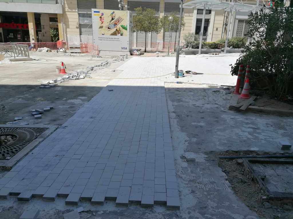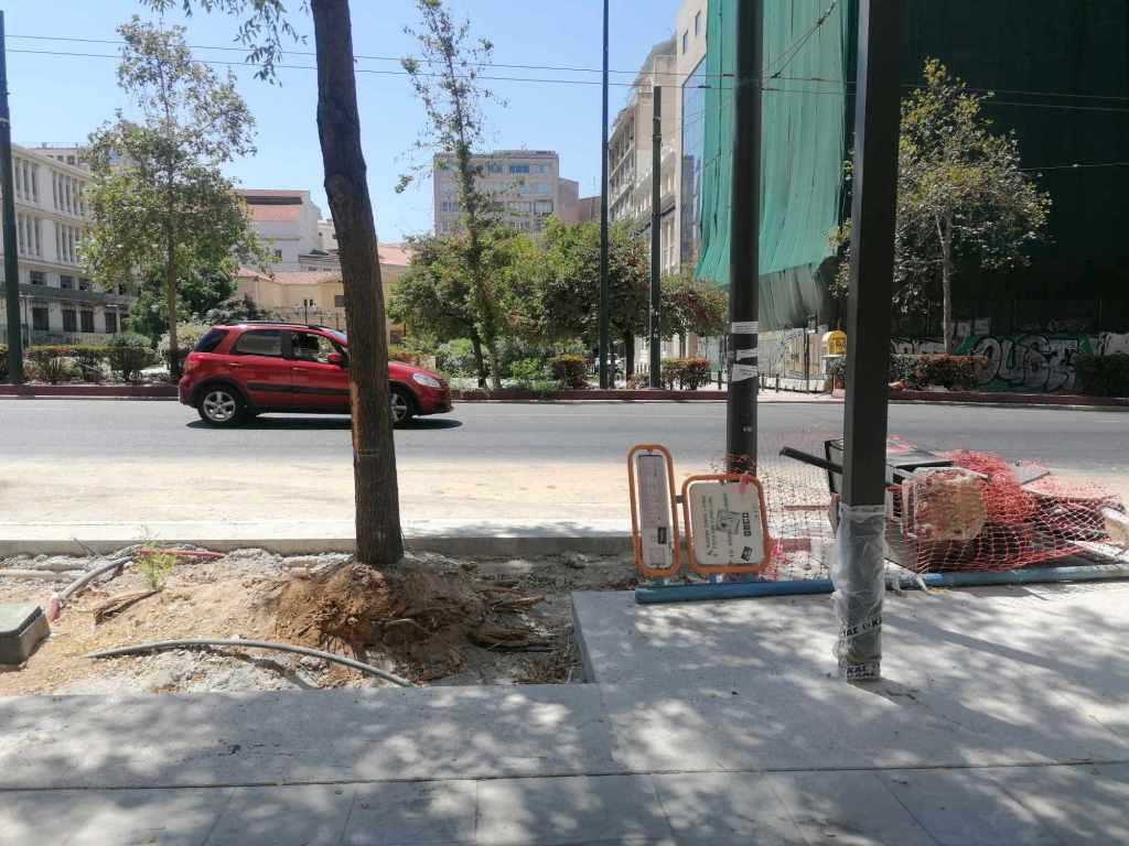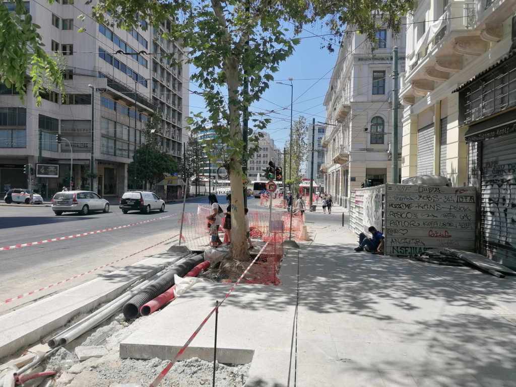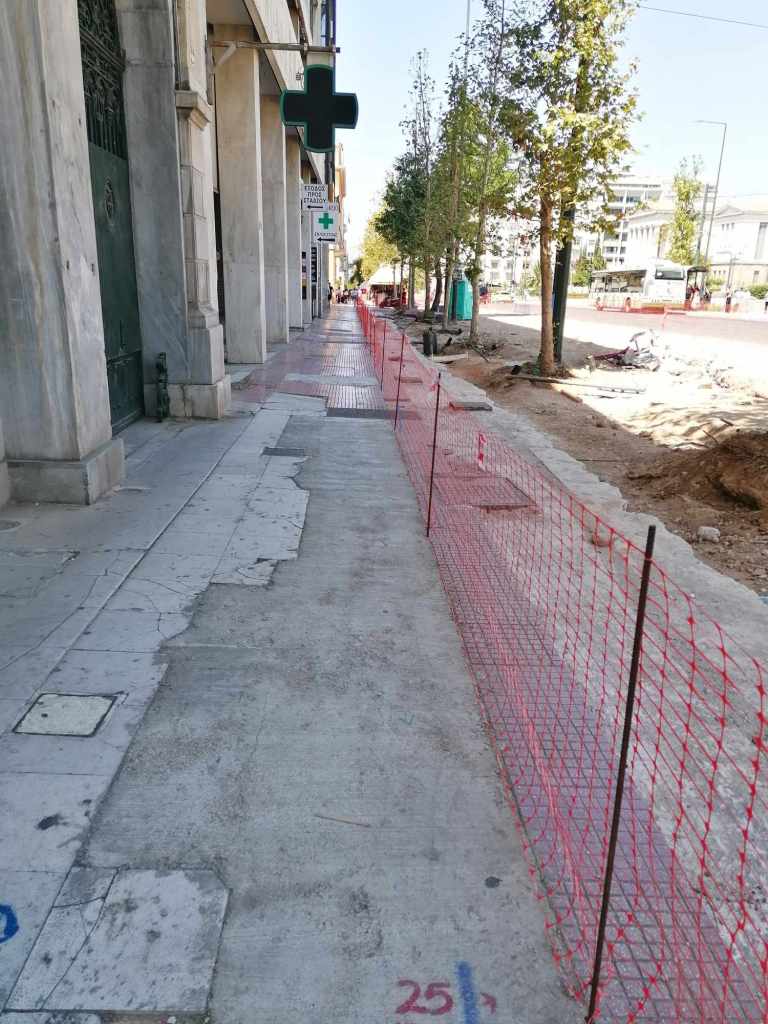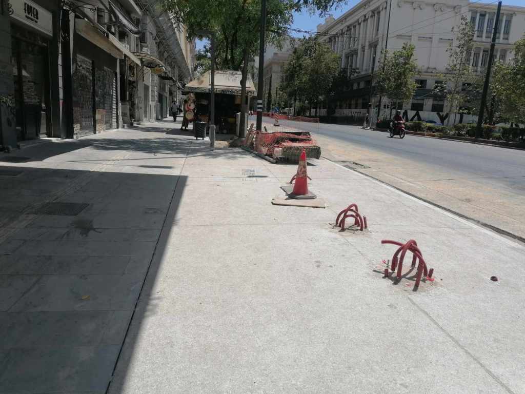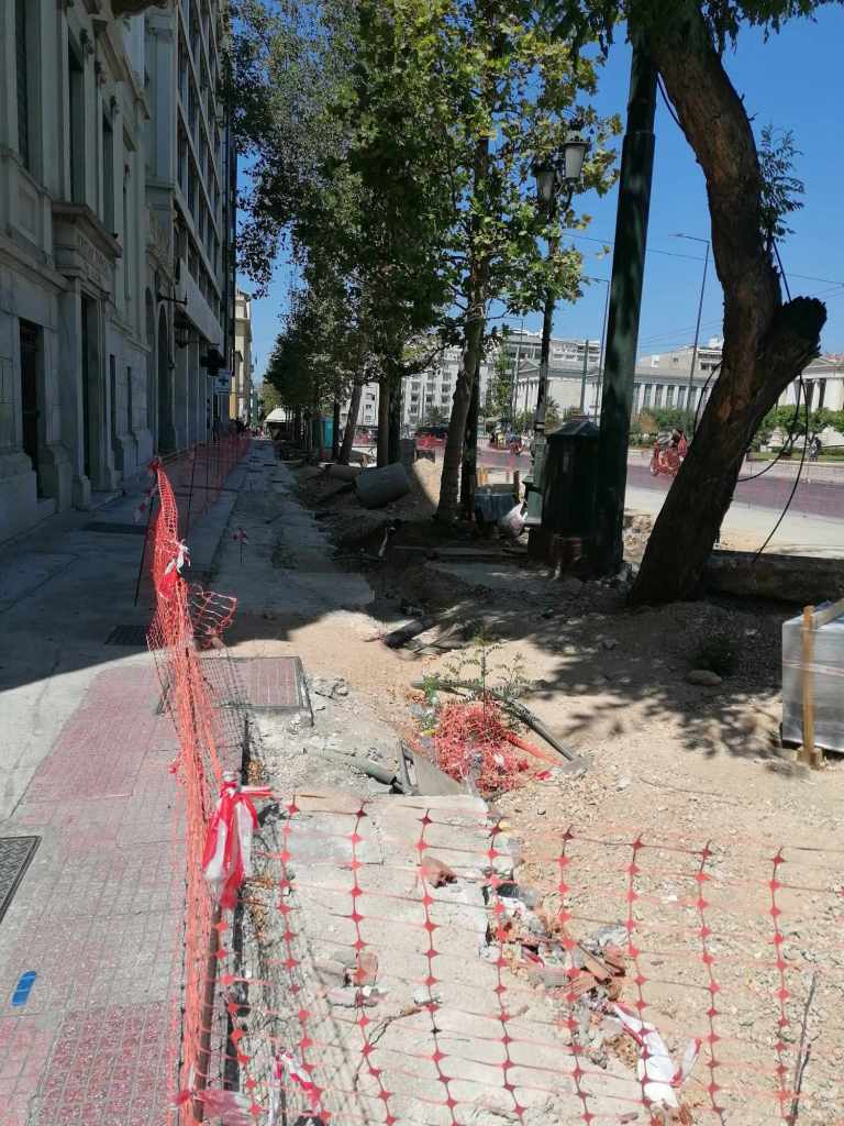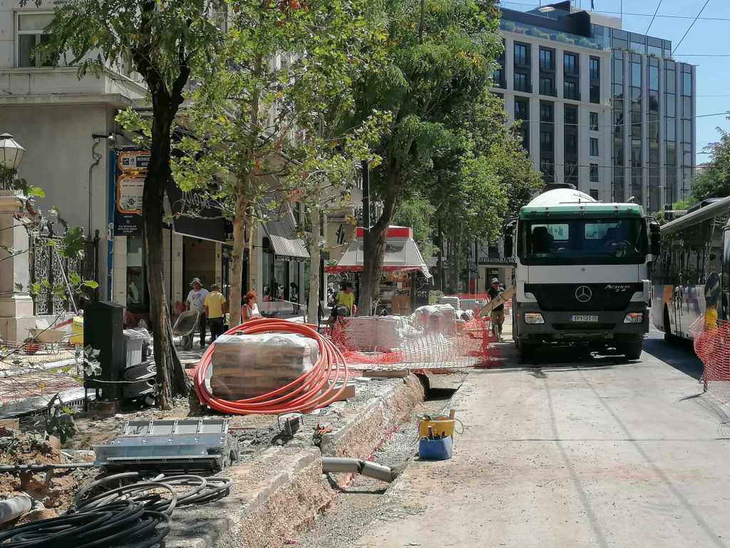 Τεράστια οπτική και ηχητική όχληση, καμιά σωστή κατασκευαστική λεπτομέρεια, απουσία προδιαγραφών υλικών, κάκιστος αστικός εξοπλισμός. Για να μην πω για τα εργοτάξια τα ίδια. Μόνο ντροπή σου προκαλούν. Κανένα μέτρο ασφαλείας ούτε για τους εργαζόμενους, ούτε για τους κατοίκους, ούτε για τους τουρίστες. Ορθάνοιχτα εργοτάξια, τυλιγμένα κατά τόπους (σε σημεία ξεχαρβαλωμένα) με πορτοκαλί πλέγματα περίφραξης, κοκκινόλευκες ταινίες σήμανσης εμποδίων ή κώνους, όπου, αλλού σκαρφαλώνεις για να προσεγγίσεις την στάση του λεωφορείου, αλλού πατάς σε κάτι ξύλινες γεφυρούλες της πλάκας ή κάτι μπαταρισμένες λαμαρίνες, αλλού βλέπεις διάσπαρτα νέα υλικά δαπεδόστρωσης, τρύπες που έχουν απλά μπαλωθεί, επικίνδυνα περάσματα, κάτι σωληνώσεις-σκοτώστρες, κάτι καλώδια και μπαλαντέζες να διασχίζουν τον δρόμο, πέντε – έξι εργάτες να παλεύουν με τις κόλλες πλακιδίων και τα τσιμέντα και να σκάβουν εν μέσω καύσωνα χωρίς καν κράνος ή γάντια. Να φοβάσαι μην σου έρθει τίποτα στο κεφάλι ή μην χαθεί η γη κάτω από τα πόδια σου. Βομβαρδισμένα τοπία. Δεν ξέρω μήπως και έχουν γίνει εργατικά ατυχήματα. Είναι πολύ πιθανό. Σίγουρα θα έχουν μπουρδουκλωθεί πολλοί περαστικοί. Δεν μπορεί. Από τύχη την έχω γλιτώσει εγώ. Ποιος άραγε λογοδοτεί για την διαχείριση αυτού του τεχνικού έργου; Πώς έχουν διασφαλιστεί τα απαιτούμενα μέτρα ασφάλειας και υγιεινής; Υπάρχει οργανόγραμμα; Όσο πλησιάζει κανείς προς την Ομόνοια εντωμεταξύ, το πρόβλημα οξύνεται. Εκπλήσσεται κανείς;