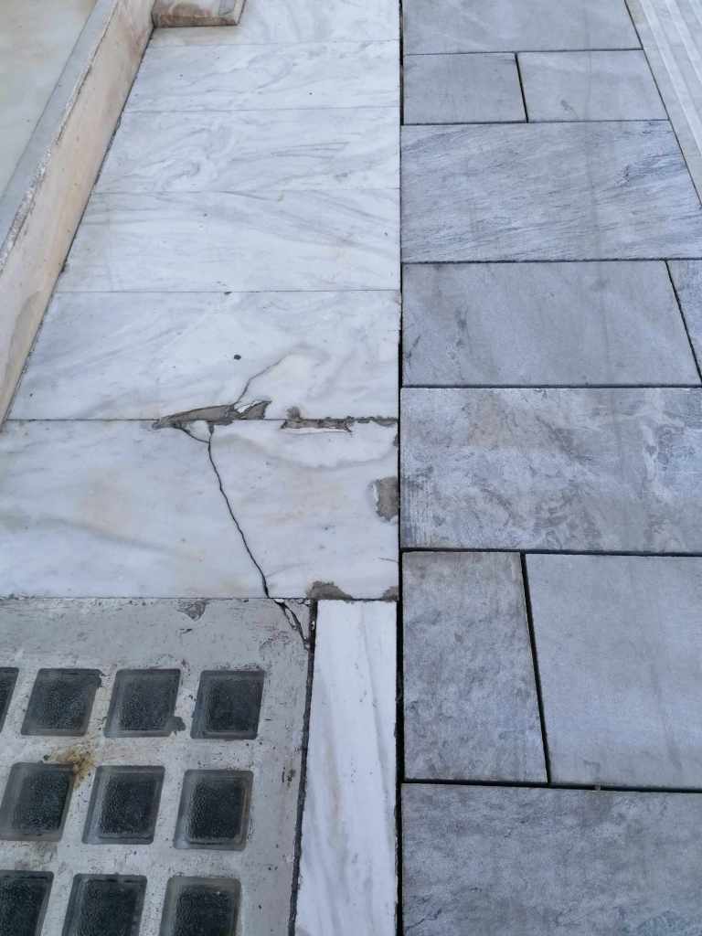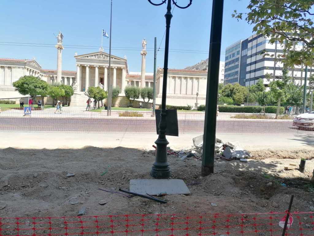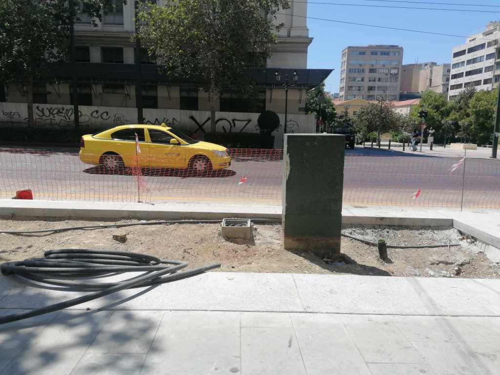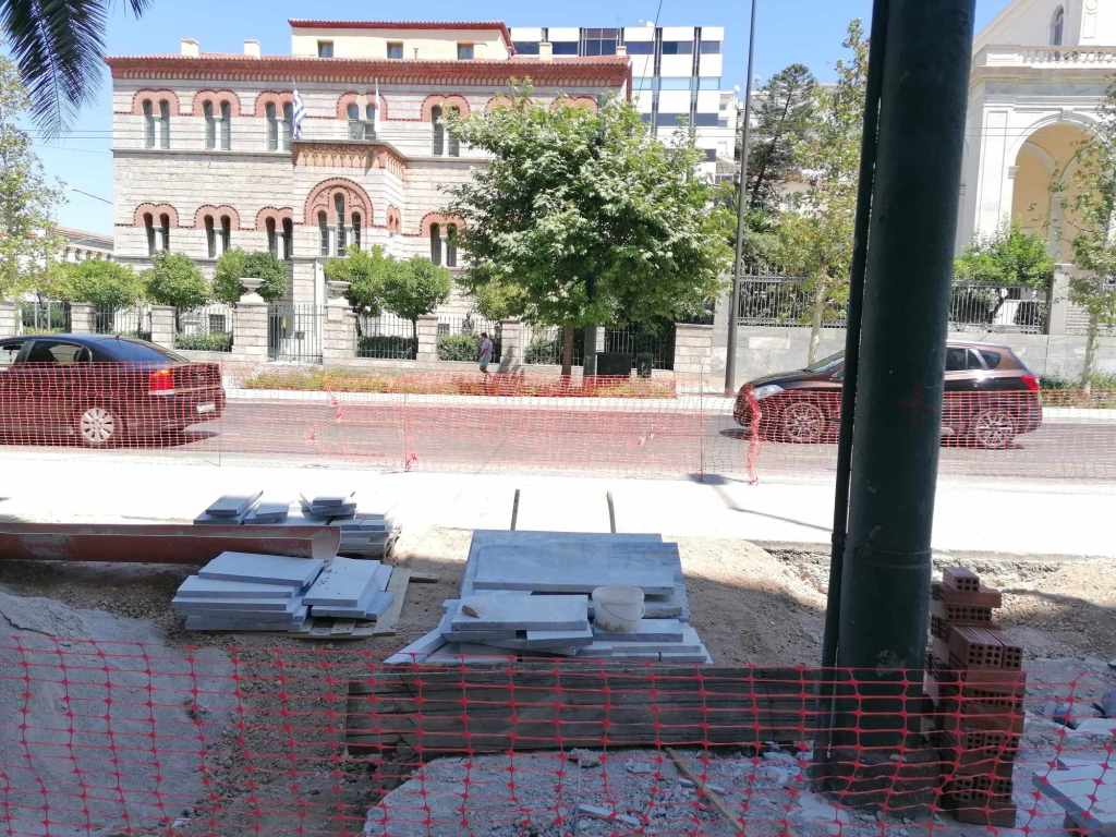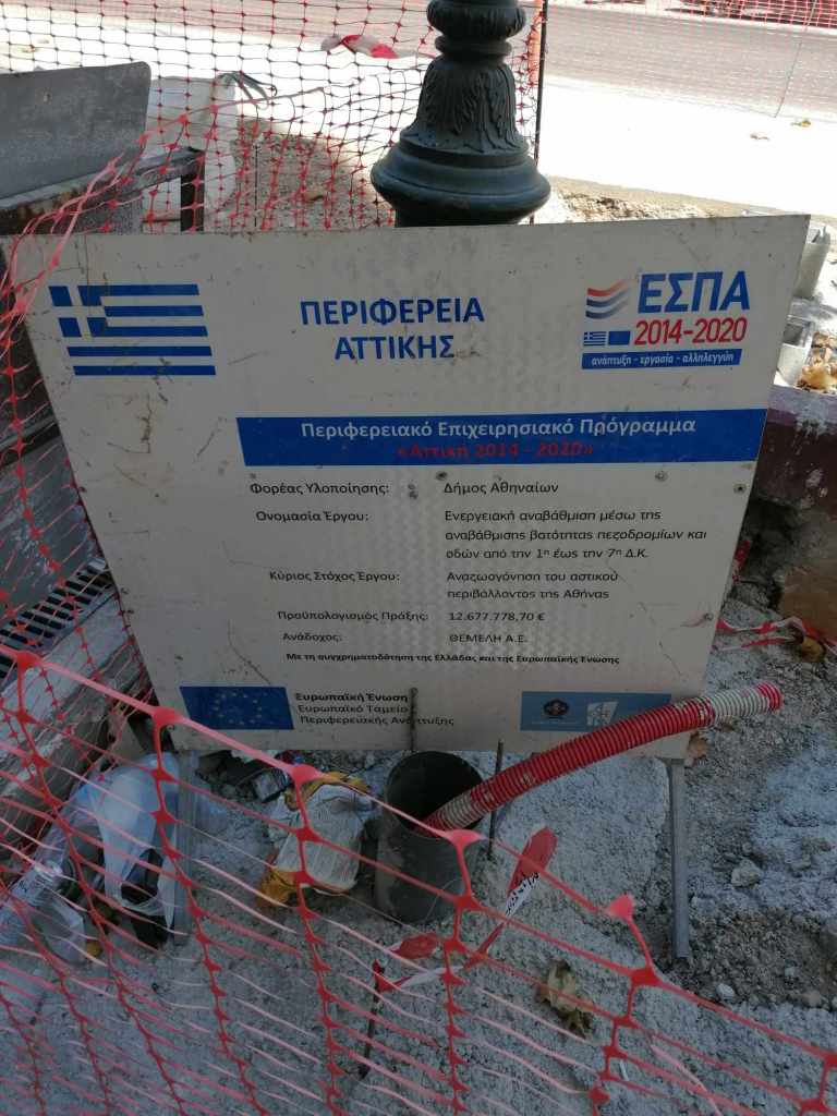 Σε επίπεδο διαδικασιών, θεσμών και διαφάνειας; Δεν υπήρξε κανένας αρχιτεκτονικός διαγωνισμός, καμιά επίσημα δημοσιευμένη μελέτη, ποιος ξέρει αν υπήρχε έγκριση από Συμβούλια Νεωτέρων Μνημείων ή και Αρχιτεκτονικής – και αν ναι, βάσει ποιας μελέτης; (ενώ θέλει κανείς έγκριση για να βάψει απλώς μια όψη όταν βρίσκεται πλησίον μνημείων, πόσω μάλλον για ένα τόσο σημαντικό έργο μπροστά στην Τριλογία!), καμιά ενημέρωση του συνολικού οικονομικού κόστους υλοποίησης του έργου, καμιά ανάρτηση πουθενά με το όνομα της εταιρείας του αναδόχου (αν και βρήκα σήμερα παραπεταμένη μια μικρή πινακίδα που έγραφε: «Περιφερειακό Υπηρεσιακό Πρόγραμμα Αττική 2014-2020, Ενεργειακή αναβάθμιση μέσω της αναβάθμισης βατότητας πεζοδρομίων και οδών από την 1η ως την 7η Δ.Κ. με ανάδοχο ΘΕΜΕΛΗ ΑΕ» & προϋπολογισμό πράξης: 12.677.778,70€, αλλά δεν έχω ιδέα αν αναφέρεται σε αυτό το έργο ή βρέθηκε πεταμένη εκεί όπως ένα σωρό σκουπίδια που βρίσκονται μέσα στο εργοτάξιο ή και έξω από αυτό).