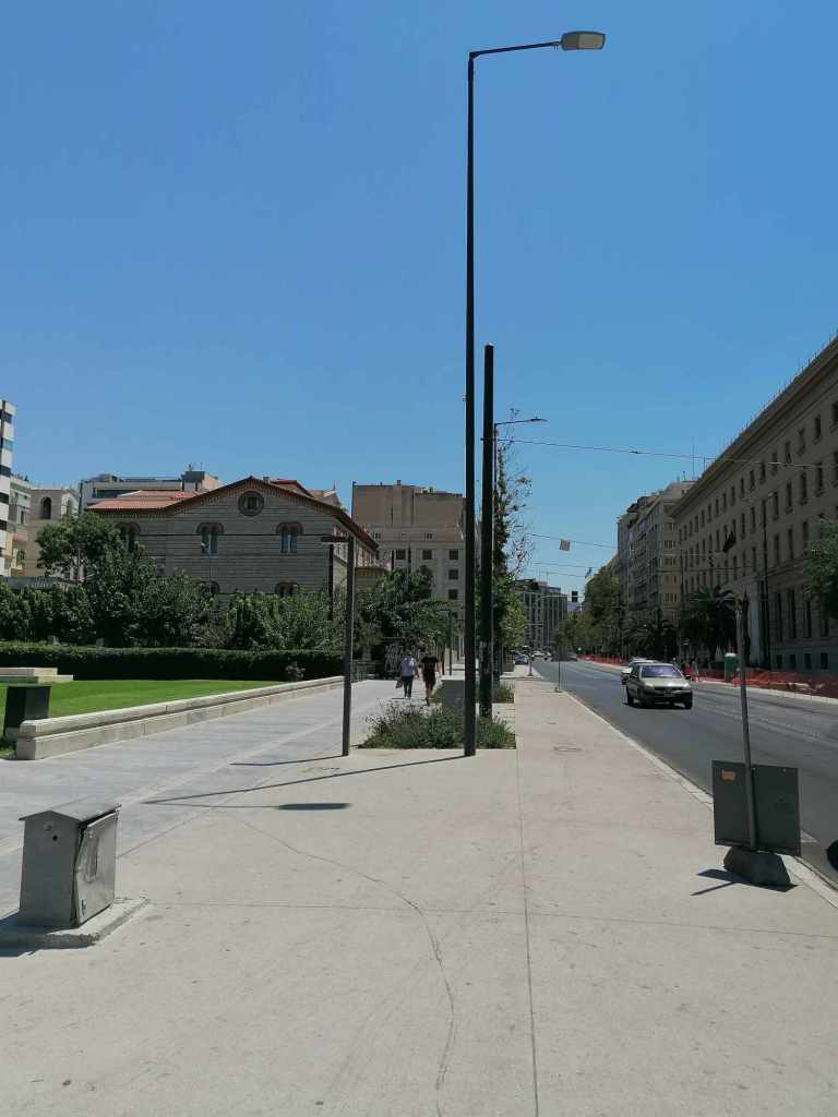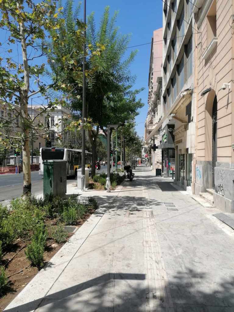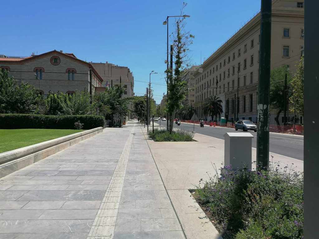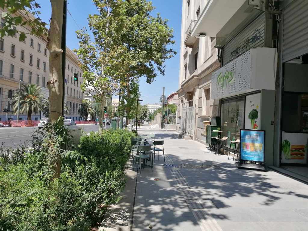 Προφανώς από τον Μεγάλο Περίπατο απουσιάζει πλήρως η έννοια της Βιώσιμης Αστικής Κινητικότητας, καμιά πρόνοια για νέα –και γιατί όχι δημοτικά; – Μέσα Μαζικής Μεταφοράς, καμιά πρόβλεψη για δίκτυο ποδηλατόδρομου. Μηδενική περιβαλλοντική συνείδηση. Δεν μπορεί παντού στον κόσμο να μιλούν για zero waste, για Cradle to Cradle (C2C), για ολιστικό σχεδιασμό & κυκλική ή ανακυκλώσιμη οικονομία χωρίς απόβλητα και ο Δήμος της Αθήνας όχι απλά να μην έχει πάρει χαμπάρι τίποτα από αυτά αλλά να τα αγνοεί επιδεικτικά. Τόνοι πεταμένων υπαρχόντων κυβόλιθων και μαρμάρων, τα πάντα αγορασμένα νέα, γιατί πώς θα ενισχυθεί άλλωστε και η «οικονομία»; Βελτίωση του μικροκλίματος; Με τα πλατάνια; Μα υπήρχαν ήδη δέντρα. Ίσως επιτευχθεί με κάτι γιασεμιά που έχουν φυτρώσει λες από μόνα τους εδώ και εκεί. Πραγματικά όμως, δεν υπάρχει σκιά, το τσιμέντο καίει και ο περιπατητής περιδιαβαίνει κάθιδρος & εξουθενωμένος. Και αφήνω για το τέλος το καλύτερο: ήδη έχουν τοποθετηθεί τραπεζοκαθίσματα επί του Μεγάλου Περιπάτου, μεταξύ της Ομήρου και της Αμερικής. Ο γνωστός Γρηγόρης πρόλαβε και έβγαλε κάτι λαδοπράσινα τραπεζάκια που οριακά δεν πατούν στην ειδική λωρίδα όδευσης τυφλών. Και είναι απλά ένα μεσημέρι Σαββάτου κατακαλόκαιρο, πριν καν αρχίσει η «αξιοποίηση» του «βουλεβάρτου».
